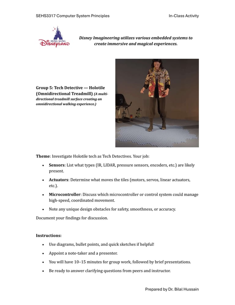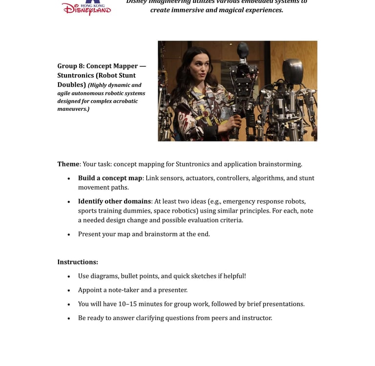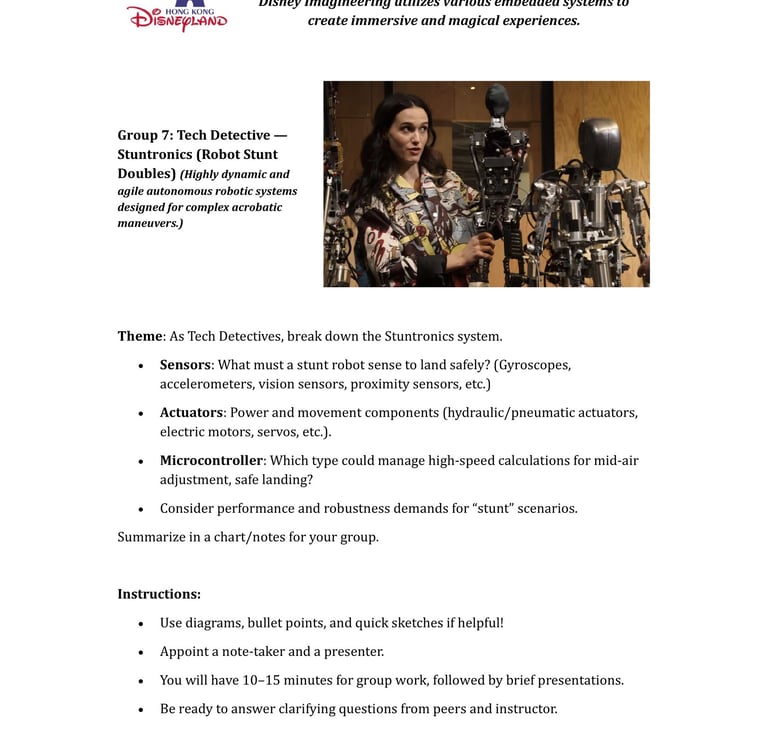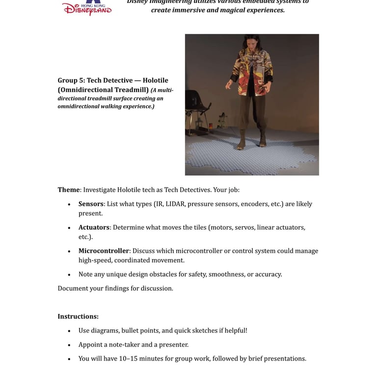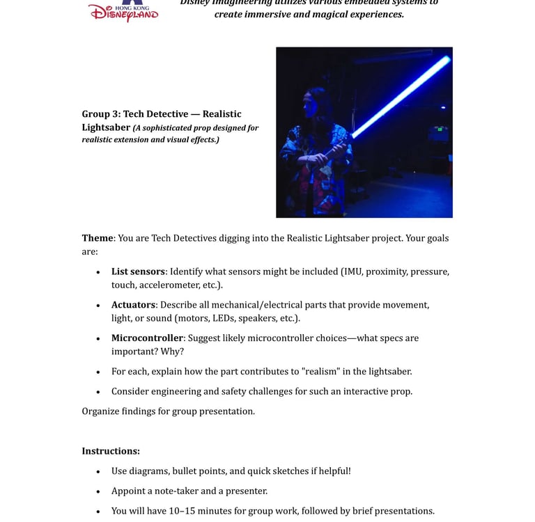 Fast-forward to June 2024: a staff retreat at Hong Kong Disneyland organized by SEHS, CPCE. Expecting rides and fun, I discovered Disney University—a hub for Imagineering, where tech wizards enhance visitor experiences through cutting-edge projects. No traditional students here; just innovative research on embedded systems, the heart of my course. We toured seminars on unrealized tech marvels, all tied to sensors, actuators, and microprocessors. It clicked: This could excite my students! I scoured YouTube for videos mirroring our experience, landing on Cleo Abram’s coverage of Disney’s California park [YouTube link]. She dove into Stuntronics (robotic stunt doubles), Droids, Realistic Lightsabers, and Holotile—a mind-bending omnidirectional floor for VR-like movement. Perfect examples of special-purpose computers!