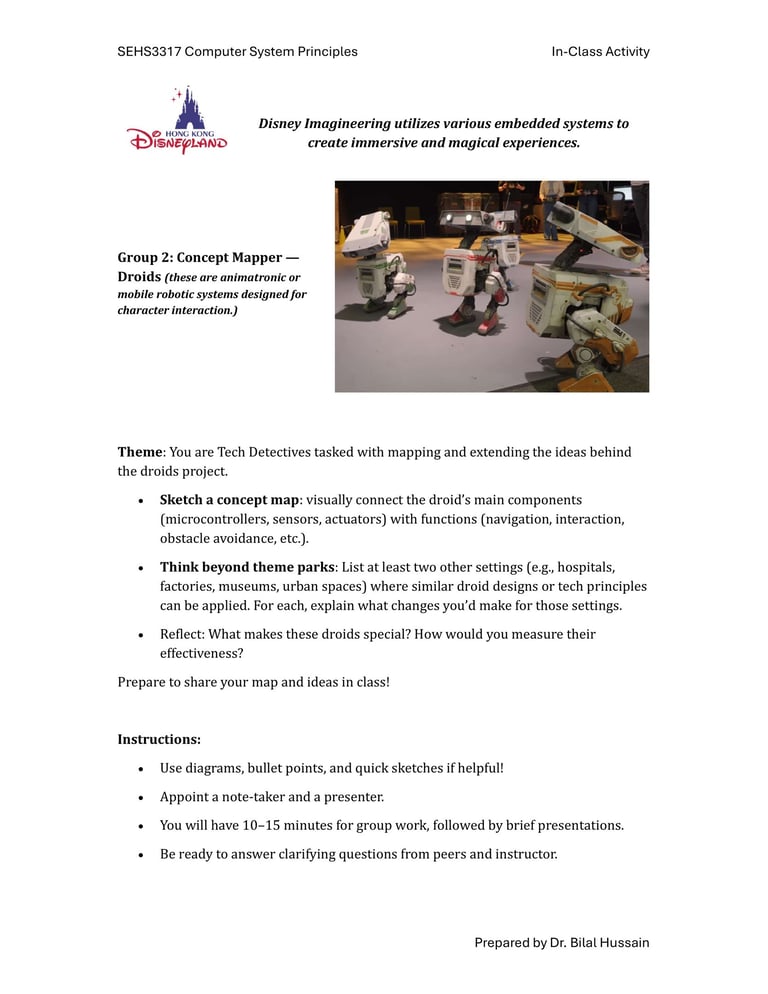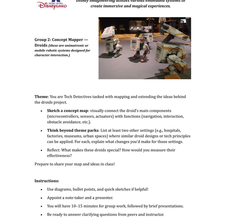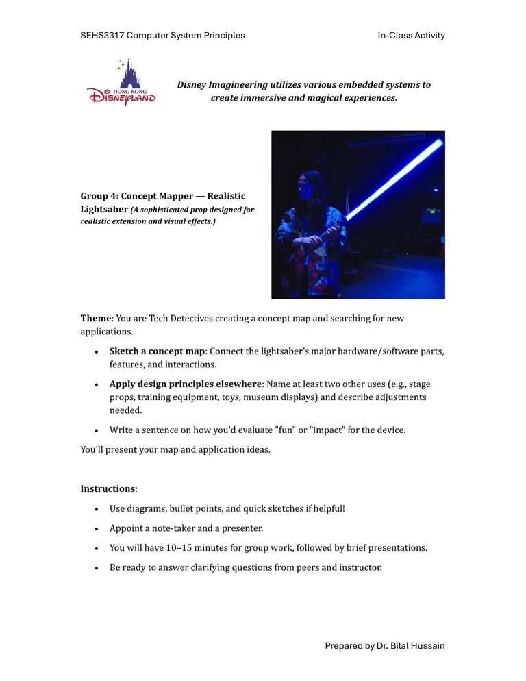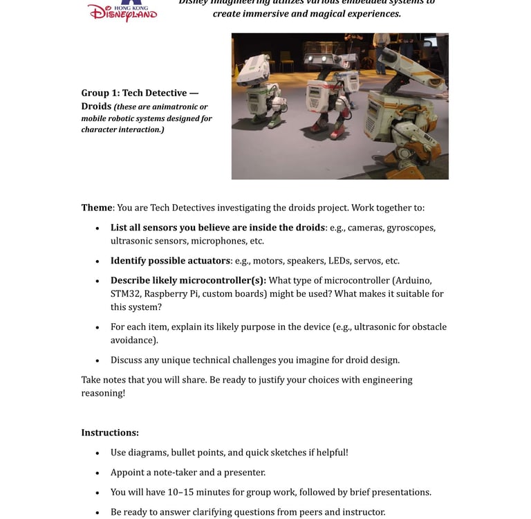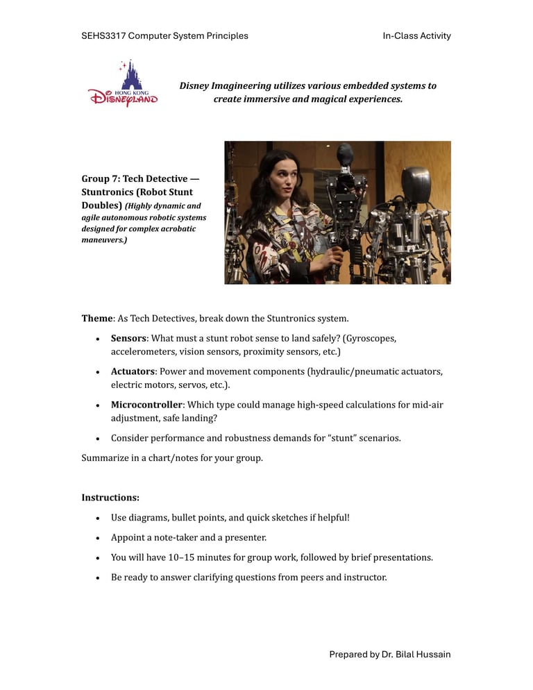 Fast-forward to June 2024: a staff retreat at Hong Kong Disneyland organized by SEHS, CPCE. Expecting rides and fun, I discovered Disney University—a hub for Imagineering, where tech wizards enhance visitor experiences through cutting-edge projects. No traditional students here; just innovative research on embedded systems, the heart of my course. We toured seminars on unrealized tech marvels, all tied to sensors, actuators, and microprocessors. It clicked: This could excite my students! I scoured YouTube for videos mirroring our experience, landing on Cleo Abram’s coverage of Disney’s California park [YouTube link]. She dove into Stuntronics (robotic stunt doubles), Droids, Realistic Lightsabers, and Holotile—a mind-bending omnidirectional floor for VR-like movement. Perfect examples of special-purpose computers!