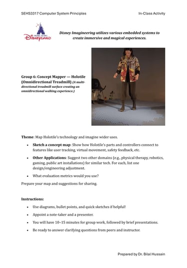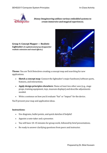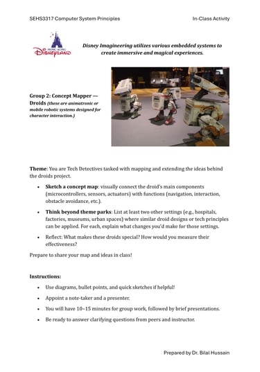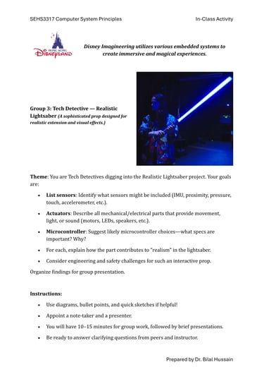Fast-forward to June 2024: a staff retreat at Hong Kong Disneyland organized by SEHS, CPCE. Expecting rides and fun, I discovered Disney University—a hub for Imagineering, where tech wizards enhance visitor experiences through cutting-edge projects. No traditional students here; just innovative research on embedded systems, the heart of my course. We toured seminars on unrealized tech marvels, all tied to sensors, actuators, and microprocessors. It clicked: This could excite my students! I scoured YouTube for videos mirroring our experience, landing on Cleo Abram’s coverage of Disney’s California park [YouTube link]. She dove into Stuntronics (robotic stunt doubles), Droids, Realistic Lightsabers, and Holotile—a mind-bending omnidirectional floor for VR-like movement. Perfect examples of special-purpose computers!